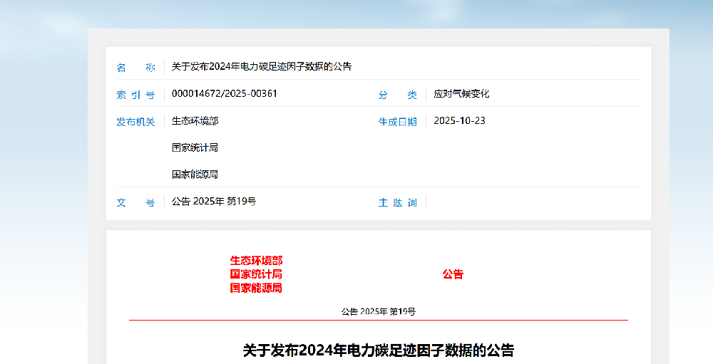 生態(tài)環(huán)境部 關(guān)于發(fā)布2024年電力碳足跡因子數(shù)據(jù)的公告